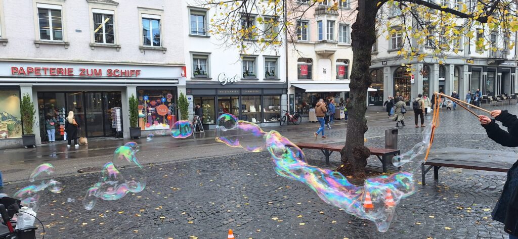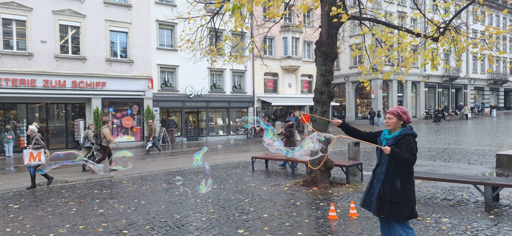 Vielleicht stellst du dir vor, dass mein Leben als Kinderbuchautorin daraus besteht, am Schreibtisch zu sitzen und zu schreiben. Richtig, das ist ein großer Teil. Aber immer wieder recherchiere ich auch für meine Bücher. Über gewisse Dinge kann ich besser schreiben, wenn ich sie erlebt, gerochen, gefühlt habe. In Venedig habe ich zum Beispiel gelernt, wie man aus farbigem Glas Bonbons machen kann. Heute war ich in St. Gallen beim Vadian und habe Riesenseifenblasen gezaubert. Letzte Woche durfte ich an der Olma eine Zuckerwatte fabrizieren und auf der Geisterbahn fahren. Alles für meine Bücher. Denn Elio hat noch so einiges vor.